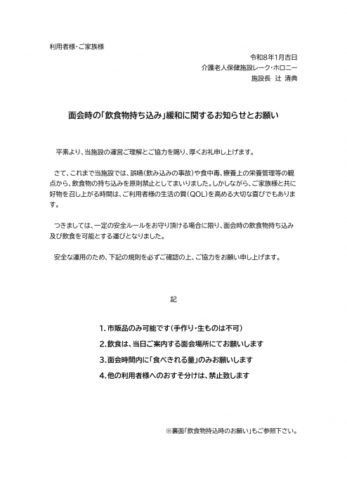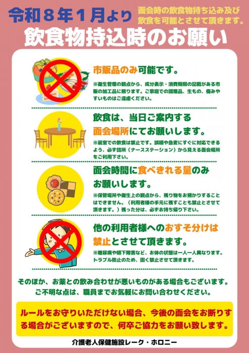 【面会時の飲食物持ち込み緩和に関するお知らせとお願い】これまで当施設では面会時の飲食物持ち込みは原則禁止と