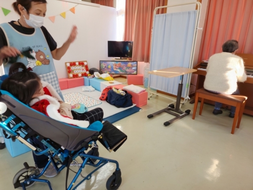 写真は入所中の利用者様で、昔園長先生をされていた方がアンパンマンマーチを演奏してくださり、皆で一緒に聴きながら楽しい時間を過ごしている場面になります☆