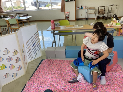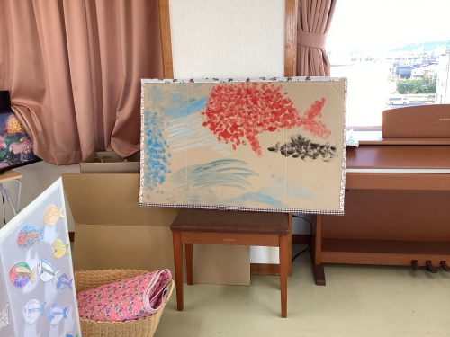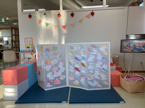パーテーションに飾られた色とりどりの沢山のお魚は施設内の高齢者の方々や、事務所スタッフが協力して作成されたものです。